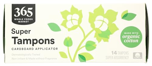 Specification: 365 by Whole Foods Market, Tampons with Cardboard Applicators, Super Absorbency, Made with Organic Cotton, Unscented, 14 Count