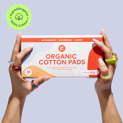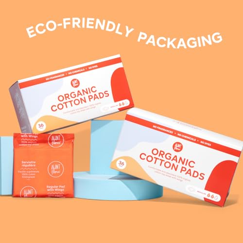 Aunt Flow Organic Cotton Pads with Wings – Regular Absorbency Menstrual Pads, Dioxin-Free, Hypoallergenic, 36 Count
