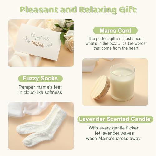 Spa-Like Relaxation Kit: Indulge her with lavender-scented candles, coconut milk soap, milk bath bombs, and ultra-soft socks—everything she needs for a calming at-home spa experience. The elegant “mama” glass cup adds a sweet touch for her favorite drink
